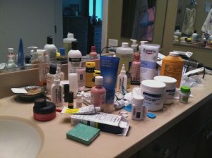 Clean off counters and table tops. Remove small appliances and put them away, put the dish drainer away and remove those toiletries from the bathroom counters.